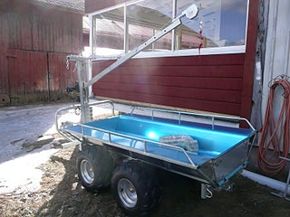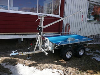 En rejäl kombivagn med kran och vinsch med fjärrkontroll. Flakmått L2000XB200XH400MM. Däck 22x11x10. Lastkapasitet 1000kg. Pris 27900 kr inklusive moms.