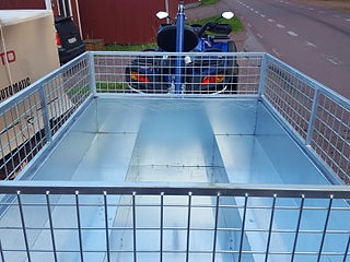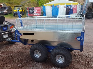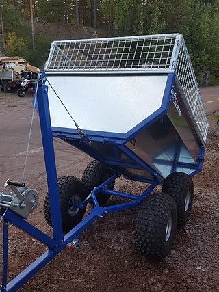 ATV-vagn Oxen BL . Har manuell vinsch till tippen som standard. Långsidorna på släpet är utformade som sitsar. En perfekt kombivagn. Nätgrindarna är i ett stycke och kan lyftas bort utan en massa skruvande. Längd: 175 cm (med dragstång: 280 cm). Bredd: 113 cm. Höjd invändigt: 55 cm (INK galler 85 cm).