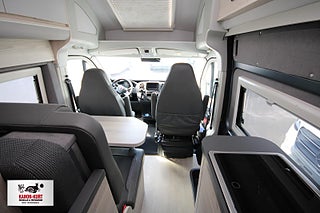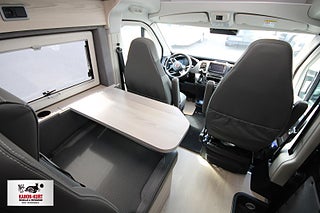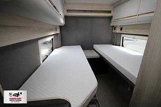 Modellår: 2024, 8-växlad automatisk växellåda, enkelsängar med elektrisk höj- och sänkbar säng samt huvudände samt bäddbart passagerarsäte, Elektriskt insteg (70 cm), Färskvattentank (isolerad) 110 liter, Gråvattentank (isolerad) 110 liter, Läderratt och läderväxelspak, Hög nivå på instrumentpanel, Crominlägg på instrumentbräda, Lackerade stötfångre fram, Svart dekor runt strålkastare, Kompressor kylskåp 90 liter, Mörkläggningsgardiner förarhytt, Takventil med elektrisk fläkt i köket, Taklucka med elektrisk fläkt på toaletten, Turbovent ventilationsfläkt x 2, Kem-toalett 19 L Invändig höjd 196 cm, Sängar bak 193 x 71 cm - 181 x 74 cm, Kurts Husvagnar AB