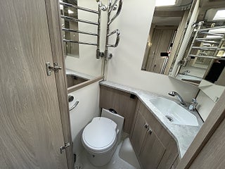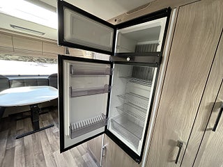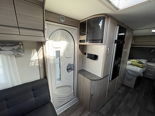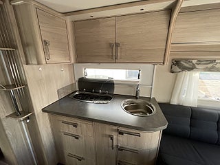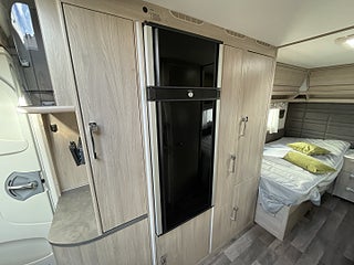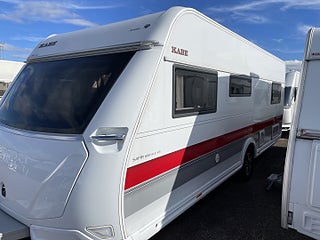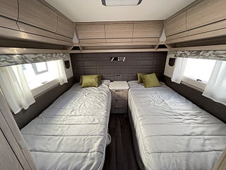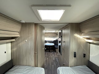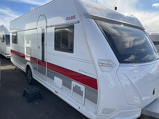 Trivsam åretrunt-husvagn med vattenburen värme, gasoluttag i koffert. Uttagen 2022-05, angiven tjänstevikt 1696 kg, Nästa besiktning 2026-05-31