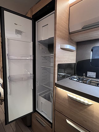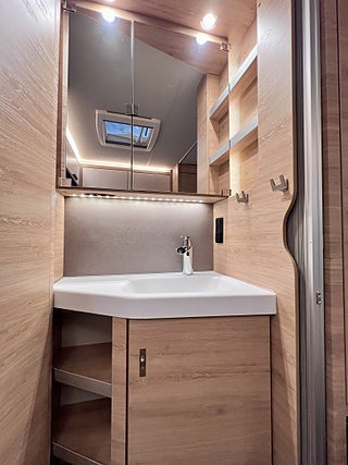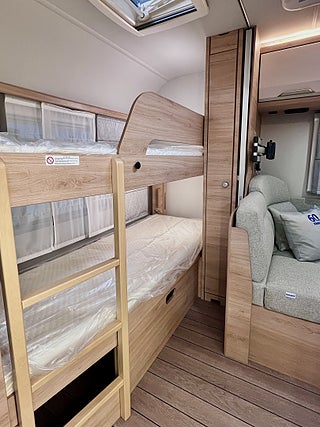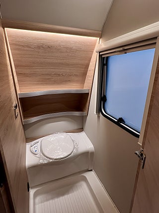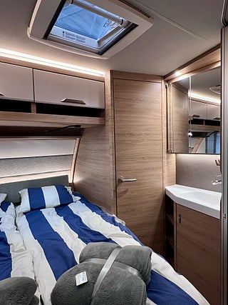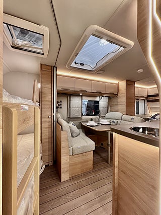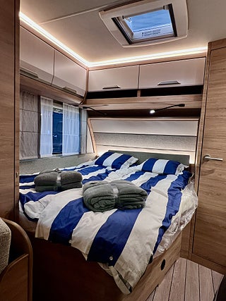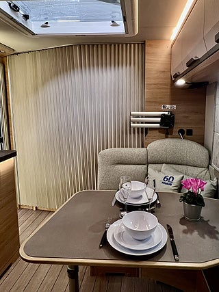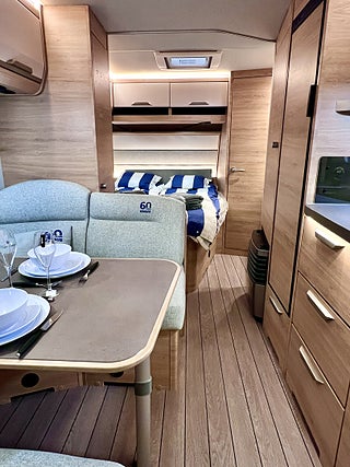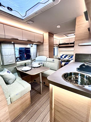KNAUS Servicebox bakom en praktisk låsbar lastlucka Inkl vattenpåfyllning och 230 V anslutning inkl avtappning färskvatten, GFK-Tak som är mindre känsligt för hagelskador, Sidoväggar i Campovolo Grey, COZY HOME paket 60 år KNAUS Celebration: 2 dekor kuddar 2 sovkuddar 2 filtar och bordsduk