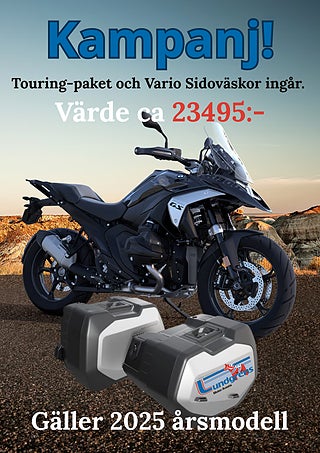 DSA (Elektronisk justerbar fjädring), Elektronisk justerbar ruta, 3 års garanti ( r1300 1300 1300gs gs gsa adv adventure ) Touringpaketet är avdraget på priset och Vario sidoväskor ingår. Spara 23495:-. Kampanjen gäller till 30 Juni.