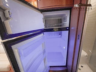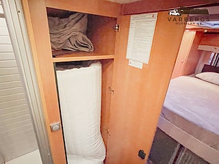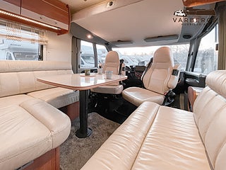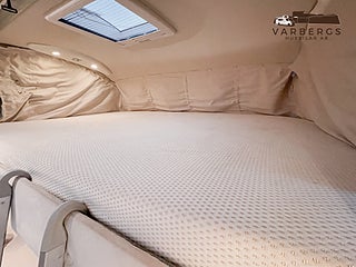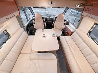 Bak finns ett bekvämt queenbed med god åtkomst från båda sidor. Längst fram finns en nedfällbar säng som ger extra sovplatser utan att kompromissa med boytan. Den stora sittgruppen med beige skinnklädsel skapar en ljus, varm och exklusiv atmosfär.