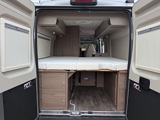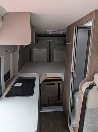 Tvärgående dubbelsäng bak, bäddbar sittgrupp