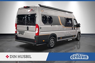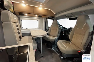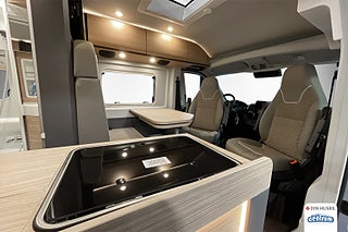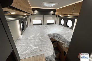 Den eleganta interiören är genomtänkt in i minsta detalj. De bekväma långbäddarna bak ger en sovlängd på över två meter och garanterar en god natts sömn efter dagens äventyr. Den rymliga sittgruppen fram med vridbara pilotstolar skapar en social och trivsam miljö – perfekt för både middagar och planering av nästa resmål.