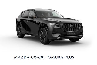 Mazda CX-60 Homura har svartlackerade 20” lättmetallfälgar och många andra svarta detaljer för ett sportigare utseende. I Homura Plus gör ett stort panoramatak kupén rymligare. Kör tryggt och manövrera enklare med en 360 graders parkeringskamera.