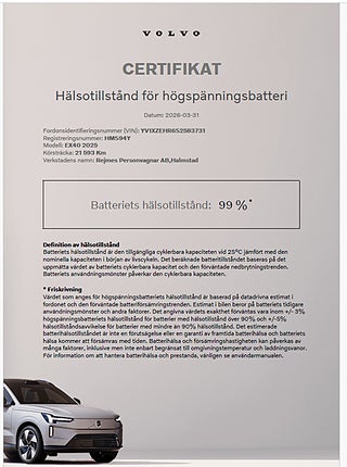 MärkeVOLVOFordonsår2025I trafik2025-03-04MiljöklassELUtsläppsklassELFärgSilver