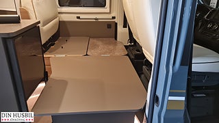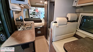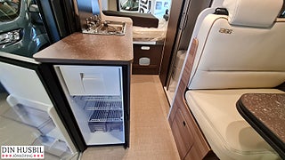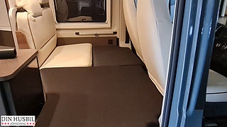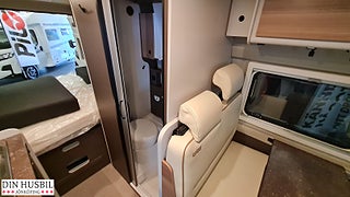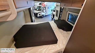 Instegshjälp för dubbelsäng bak, Myggnätsplissé för skjutdörr, 2-lågig spis med integrerad diskho och separat glaslock, Kompressorkylskåp 84 l (varav frysfack 6 l), Multimediasystem inkl. backkamera