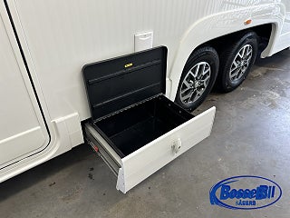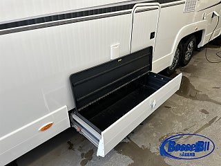 Stort garage samt utdragslådor i kjol för bra förvaring