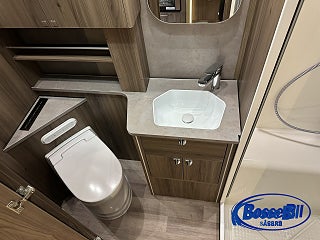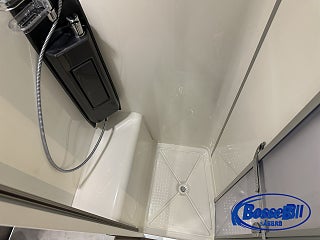 Badrum med Cinderella förbränningstoalett handfat toalettskåp och separat dusch