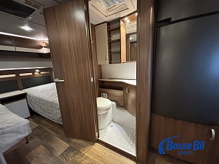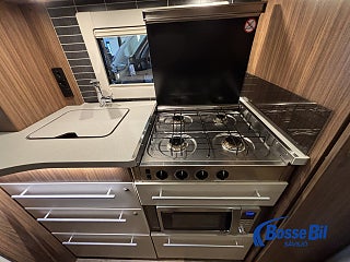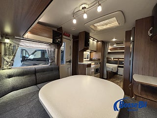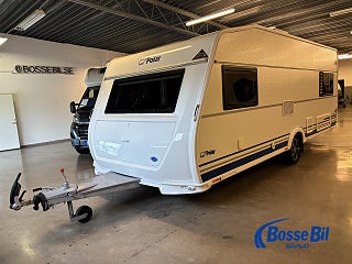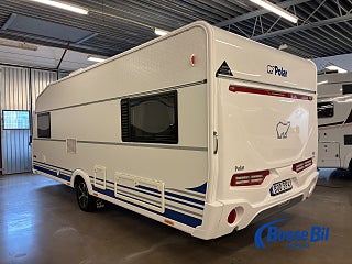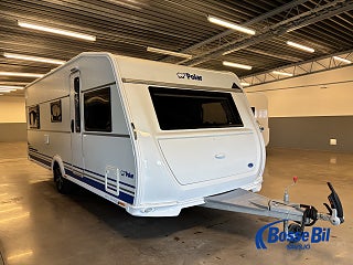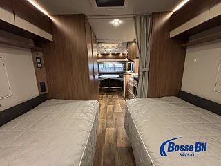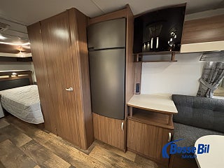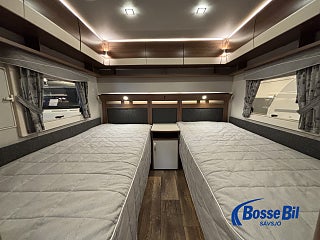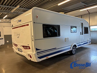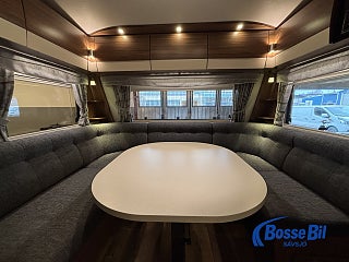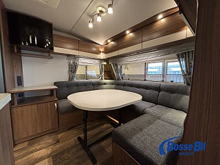 Praktisk husvagn med smarta lösningar. Stor rund soffgrupp fram som enkelt byggs om till ytterligare två sovplatser. Rymligt kök med gott om förvaring en 4 lågig spis och mikro samt stor kyl / frys. Bak i vagnen finner vi två rymliga långbäddar och även här gott om förvaringsmöjligheter.