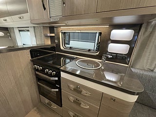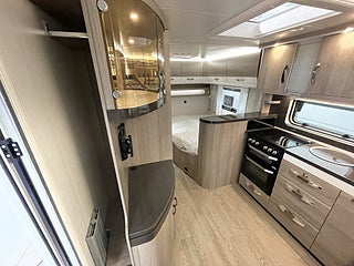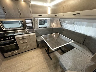 ALDE Compact 3020 HE från modell 545. (lastlucka utgår), Köksfläkt Dometic med hastighetsreglering. OBS! Modellberoende se datablad, GEBO Antennmast med Koaxialkabel, 3-ledat TV-fäste inkl. kabeldragning, USB-laddningsuttag inklusive uttag vid barnsäng- lampor., ALDE Vattenburen golvvärme. OBS! se datablad för modeller, Spis THETFORD inkl.grill och en elektrisk kokplatta. Endast PRESTIGE