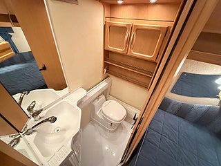 Badrum med toa handfat samt förvaring