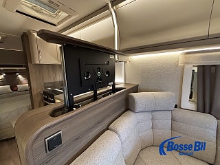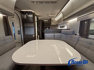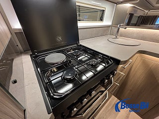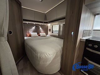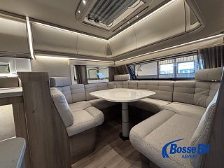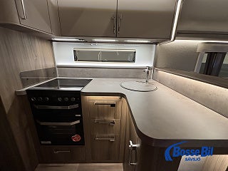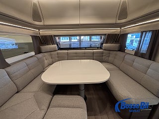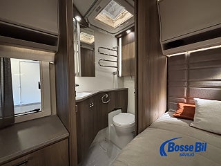 En rymlig soffgrupp i fören med nedfällbart bord för att skapa 2 extra sovplatser. Rymligt och modernt kök där du får tillgång till stor spis kombinerad med både gasol och el. Köket Erbjuder även ugn och grill samt en stor kyl och frys med möjlighet att öppna både från höger och vänster. Bak har vi en stor och mysig fransk bädd med goda förvaringsmöjligheter undertill. I anslutning med sängen hittar vi även badrummet. Toalett och handfat med duschmöjlighet samt badrumskåp och handdukstork.