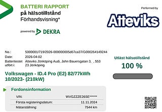 Som elbil erbjuder den tyst och smidig körning med låga driftkostnader, samtidigt som det kraftfulla batteriet på 77 kWh och en effekt på hela 286 hk ger en stark och effektiv körupplevelse. Perfekt för både vardagspendling och längre resor.