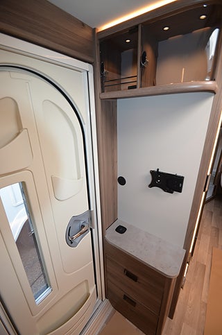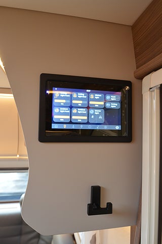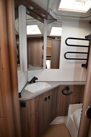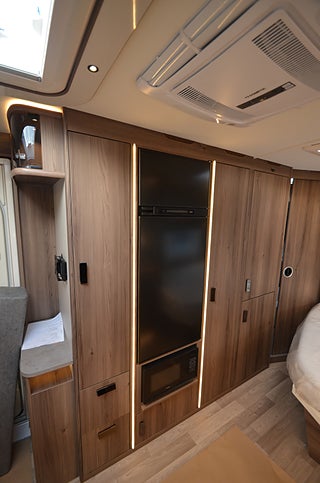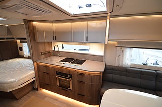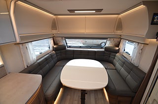 AL-KO helgalvaniserat stålprofilchassi med självjusterande bromsar, Dekaler i luftintagen nedtill fronten, Elektroniskt stabiliseringssystem, Exklusiv kaross med integrerad runtomprofil, Formgjuten skyddsmatta i gasolkoffert, Krängningshämmande friktionskoppling, Mellantonade fönster med steglöst myggnät och mörkläggningsgardin, Påskjutsbroms med backautomatik, Skidfack med utdragbar botten, utvändig låsbar lucka och belysning, Stadig och fuktsäker kaross, Vagnsbred integrerad gasolkoffert i ABS med belysning, Ventilerande takluckor Mini Heki med myggnät och mörkläggningsgardiner, Ytterdörr (Seitz) med fönster, integrerat myggnät och tröskelvärme, 12V cirkulationspump / elpatron 230V, Aircondition ? Fresh Jet FJX4 2200, Alde Compact 3030 centralvärme med touchscreen för klocka, Automatiskt vattenburet golvvärmesystem - 4 slingor och shuntsystem (-AGS II Pro)-, Belastningsvakt som automatiskt minskar / kopplar bort pannans strömförbrukning, Optimerat ventilationssystem, Torkskåp med droppfat och stängningsbar ventilator, VarioVent - unikt ventilationssystem, Anslutning för utvändig dusch / varmt och kallt vatten, Arbetsbänk i Atlas Zeder med hybridspisen gas-under-glas (induktionshäll och två gasolplattor) samt inbyggd ugn, KABE AutoDrain (automatisk tömning av vattensystemet), Kylskåp 230 V / 12 V / gasol. Volym 167 liter, Kylskåpsfront blanksvart metallic, Optimerad kylskåpsventilation, Plexi med belysning vid arbetsbänk, Spillvattentank 32 liter (inbyggd samt utvändig spillvattensäck), Spis med elektrisk tändning, Upphängningslist med två krokar, Vattentank 40 liter med utvändig påfyllning, 2 skinnkollektioner (Baltimore, Hollywood) och en i artificiellt läder (Las Vegas), Antislip-beklädnad undersida dynor, Barskåp med tonat plexi och flaskförvaring (från sidan) i hurts, Exklusiva luckor överskåp, Gardinupphängning med kappa, Högkvalitativa snickerier, Indirekt belysning undersida överskåp, Nackstöd ? höj- och sänkbart samt justerbart i sidled, Porslinsskåpsluckor Sabbia High Gloss, Taklampa klädd i mockaimitation (samt FK belysningsramp fram), Utdragsskiva bord (ej väggfast bord), Överskåpsluckor fram och bak Cashmere, Draperi (ingår i vissa modeller), Elektrisk huvudgärde säng (ej E9 säng), Spiralmadrass 12 cm + bäddmadrasser 6 cm (gäller ej våningssängar / överbäddar), Anslutning för utvändig dusch / varmt och kallt vatten, Automatiskt vattensystem / varmvattenberedare, Duschkabin / Duschkar och handdusch / Duschdraperi och skena, Handdukstork (vissa modeller med timer), Laminat Light Concrete i bänkskiva (ljus betonglook), Vridbar spoltoalett med keramikskål, fast installerad med utvändig tömning, 12V-anslutning med 13-polig kontakt, Dimmer ljusramp vid framgrupp, Dimmer stämningsbelysning kök, Elbox med utvändig 230V / 12V uttag, belysning med strömbrytare, Garderobsbelysning samt belysning i sänglådor, Indirekt belysning överskåp bak, KABE Premium Sound System DAB, LED-belysning i samtliga lampor, LED-belysning vid kylskåp Neonflex, Servicecenter med kontrollpanel, Smart Level (Gasolnivåsensor, TV-antenn med förstärkare, Utvändigt 230 V / 12 V uttag, Avfallshink med källsortering, en nyckel till samtliga lås, Instegsgarderob (i vissa modeller), Utvändig gasolanslutning för grill placerad i gasolkoffert