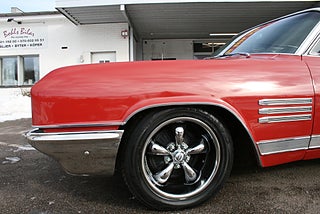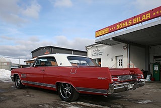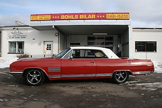Buick Wildcat Coupè 1964 årsmodell, den 401 kubiktum stora Nailhead V8 motorn med hela 445 lb i vridmoment går fint tillsammans med den 3 stegade automatlådan, både styr och bromsservo, läcker färgsättning med en fyllig klarröd kulör och vitt tak, svart inredning i fint skick med Bucket Seats och den snygga mittkonsollen med Wildcat emblemet, utrustad med tiltratt, dubbla speglar och antenner samt stereo, 17" tums Smoke Chrome Coys fälgar med fina däck, nya Hi-Jackers bak, nytt värme element, kylfläkt m.m, mätaren står på 71000 miles vilket motsvarar ca 11700 svenska mil, en "Turn Key Cruiser" i mycket fint skick redo för sommarens träffar! ett bra alternativ till syskonen Le Sabre, Electra 225 och Riviera, Vi har fler USA-bilar och klassiker i hallen, finans och ev transport och export kan ordnas, förmånlig entusiastförsäkring, ring oss gärna innan visning för bästa service samt säkerställa att bilen är kvar och vi är på plats, Bohls Bilar AB Säljer Byter Köper och Förmedlar ditt Classic fordon i Nybro sedan 2004, följ oss gärna på FB för senaste nytt samt fler bilder och videos på våra salubilar, Välkomna önskar Joakim med personal!