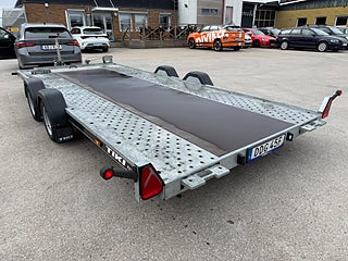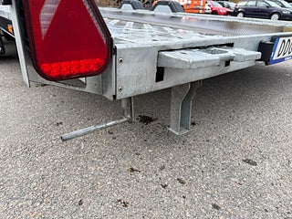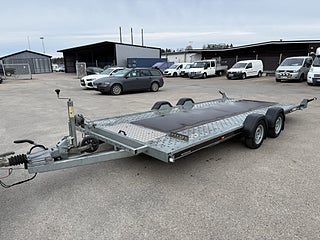 Stort lågbyggt biltransportsläp (biltrailer) där lastytans mått är hela 500cm x 209cm