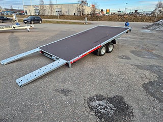 En rejäl multitrailer från Temared med flakmått 405x210cm. Totalvikt 2700kg med lastvikt 2096kg. vinsch, korta ramper är standard. Finns i lager för snabb leverans.