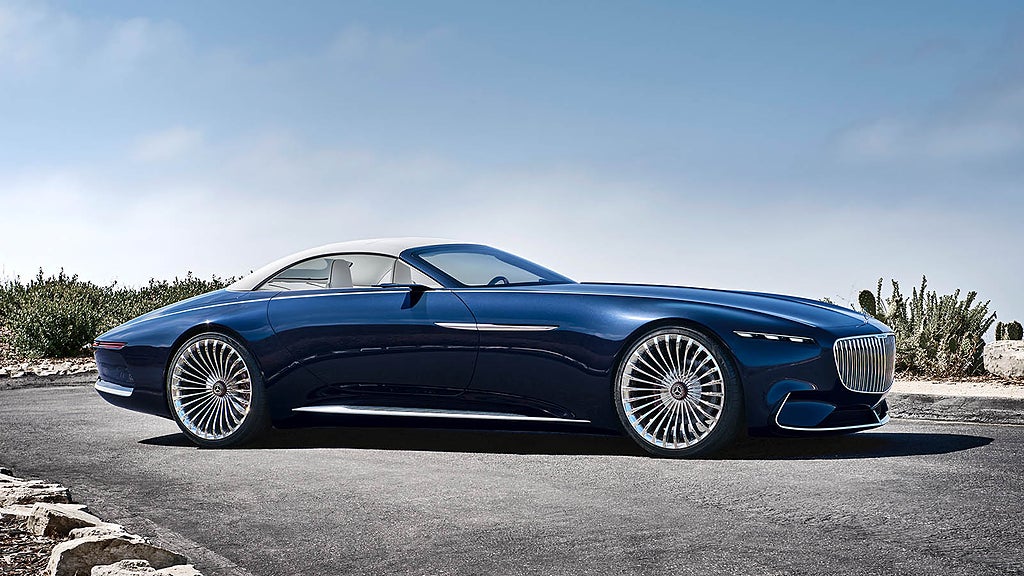 Nej, här finns inte en rak fjortoncylindrig motor under huven, något som man annars skulle kunna förledas att tro av proportionerna att döma. Vision Mercedes-Maybach 6 Cabriolet är samma andas barn som Bentleybilen ovan, en eldriven dröm med fällbart tak.