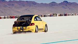 Men Volkswagen undrade lite hur fort Beetle egentligen kan gå. Med motorn uppvriden till 550 hästkrafter med hjälp av väldigt mycket turbotryck satte de fart på det årliga World of Speed på den uttorkade saltsjön.
