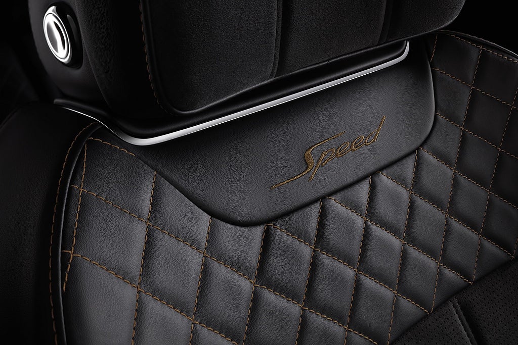Interiört har Bentayga Speed fått en rejäl översyn och ska kännas mer sportig än elegant. Bland annat ny kontrastsöm på diamantmönstret, och för första gången Alcantara-material i en Bentayga. Nya skulpterade dörrsidor ingår också i konceptet.