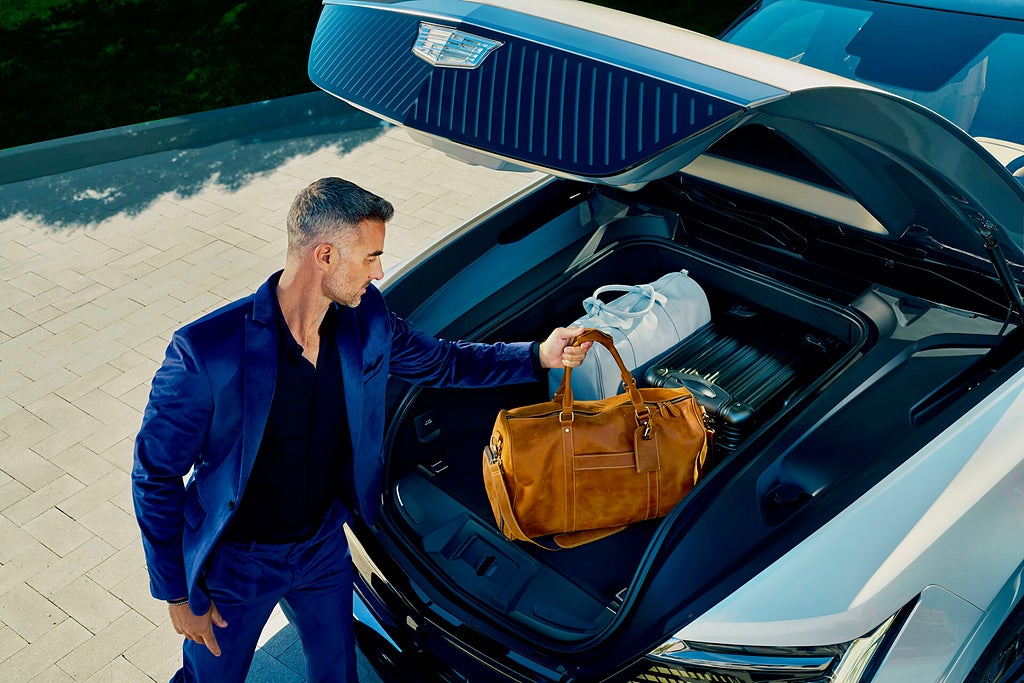 Escalade IQ har en frunk, ett bagageutrymme fram som är så stort att mannen på bilden måste ha sträckt på sig för att få in sin resväska. Den så kallade eTrunk är med sina 345 liter, lika stort som det enda bagageutrymmet i många små och kompakta kombibilar och SUV:ar. Det stora bagageutrymmet, som är det som är en del av förarhytten: upp till 3 374 liter.
