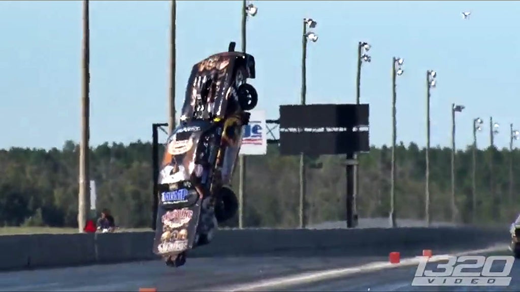 Snart visar det sig att fågelvägen är fel väg för en dragster och Jacksons Mustang kysser betongbarriären innan den slår sig till ro upp och ner i slutet av strippen. Turligt nog kunde han ta sig ur vraket och lovar på sin Facebooksida att snart vara tillbaka.
