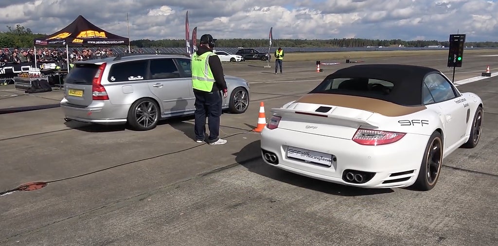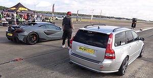 Volvon tar sig bland annat an en McLaren 600 LT med 600 hk i ett 1000 meters dragrace. Vinnaren är den som når högsta hastigheten. Hur det slutar kan du se i filmen här ovan, men låt oss avslöja att Volvon i alla fall inte skämmer ut sig…. V50:n får också mäta sina krafter mot en vråltrimmad Porsche 9ff turbo.