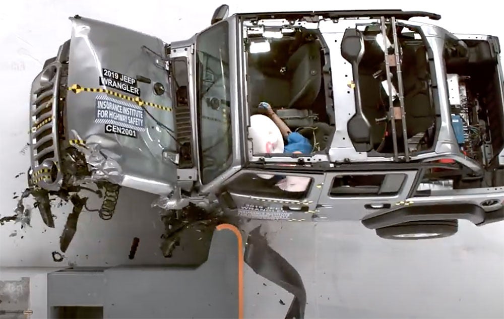 Det här är ingen smickrande film för Jeep Wrangler av 2019 års modell. För första gången har en modell misslyckats så fatalt i krocktestet, som utförts i många år av den amerikanska organisationen IIHS (Insurance Institute for Highway Safety).
