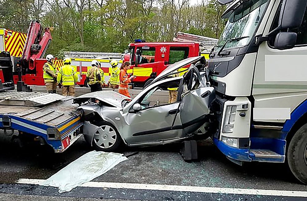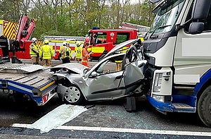 I en silverfärgad Nissan Almera körde en manlig förare i 40-årsåldern som hade bråttom. För bråttom, visade det sig. Han körde om en lastbil, men hamnade genast bakom en annan lastbil. Längre fram på motorvägen hade kö bildats och trafiken saktat ner. När långtradaren framför stannade in uppmärksammade Nissan-föraren inte situationen tillräckligt snabbt utan kraschade in i lastbilens bakdel. Men sekunderna senare blev det ännu värre när lastbilen bakom personbilen inte hann reagera utan körde på Nissan bakifrån. Bilen pressades ihop som i ett skruvstäd med flera tons krafter.