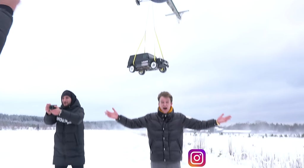 Är det här årets dyraste Youtube-klipp? Ryska youtubern Igor Moroz krossar sin Mercedes Geländewagen AMG G63 mot marken med hjälp av helikopter. Miljonbilen förstörs på en sekund.
