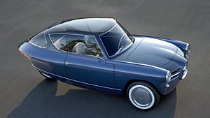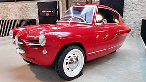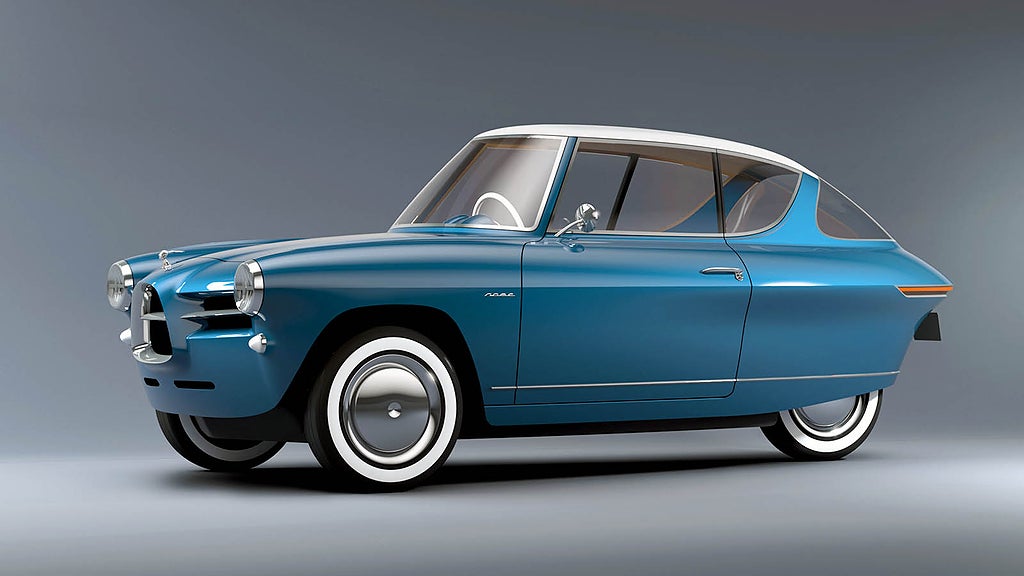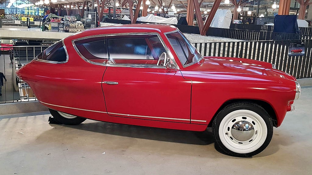 Men det är ju förstås utseendet som är bilens raison d’être. Är det en gnutta Wolseley över den där fronten? Edsel? Upp-och-ner-vänd Alfa Romeo 1900? Från sidan ser man väl toner av Fiat 2300 S Coupé och kanske också ett korn av Studebaker Avanti. Bakifrån är den förstås en båt och helheten ser ju riktigt kul ut.