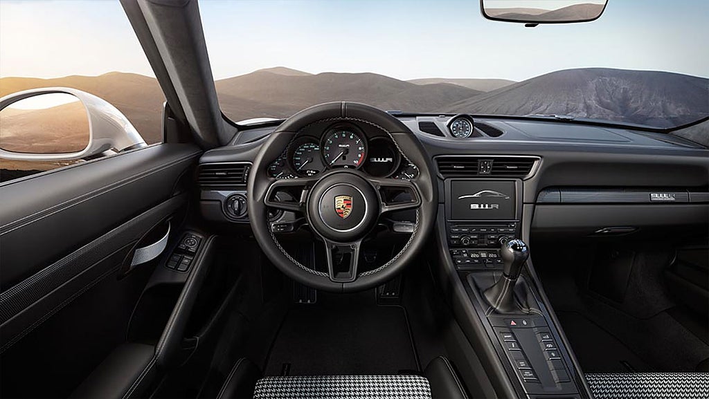 Föraren sitter i en skalstol av kolfiber där det tygklädda mittpartiet har ett Pepita-mönster som påminner om den första generationen 911 från 60-talet.