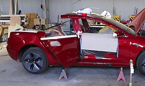 För dig som inte orkar se hela videon kan vi berätta att Simone och gänget lyckades. Baksätet togs bort och de sågade bort endast en del av taket. Bilens bakdel, där ett lastgolv monterats, har fortfarande de ursprungliga Tesla-bakljusen, stänkskärmarna och till och med den ursprungliga bakluckan.