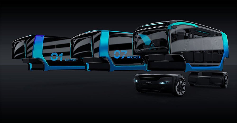 På en av bilderna ser du hur Scania har löst det: genom att skapa moduler för de olika ändamålen. Fronten och bakdelen på bussen är densamma, men i mittpartiet kan olika delar kopplas på. En modul med säten där bussresenärer kan sitta, en modul för varutransport och en modul för sophantering.