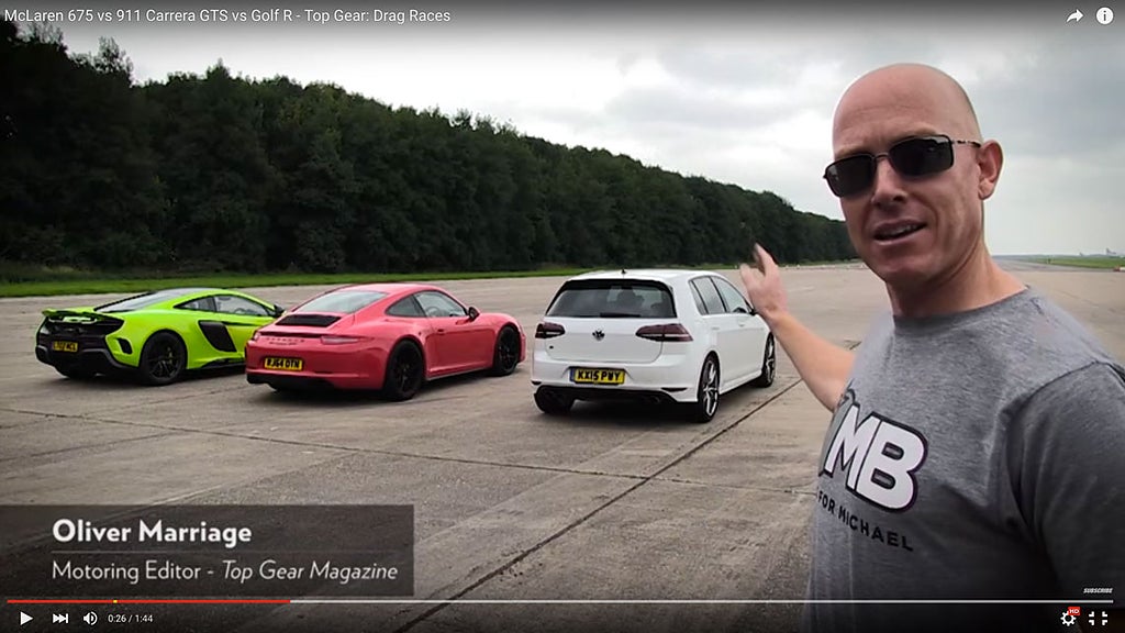 Här är Top Gears senaste konsument-test över 402 meter, för alla som undrar hur snabbt en McLaren kör ifrån en Porsche som kör ifrån en Golf.