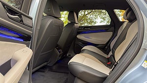 Bilens baksäte med svart och beige klädsel, rymligt med blå belysning längs dörrpanelerna.