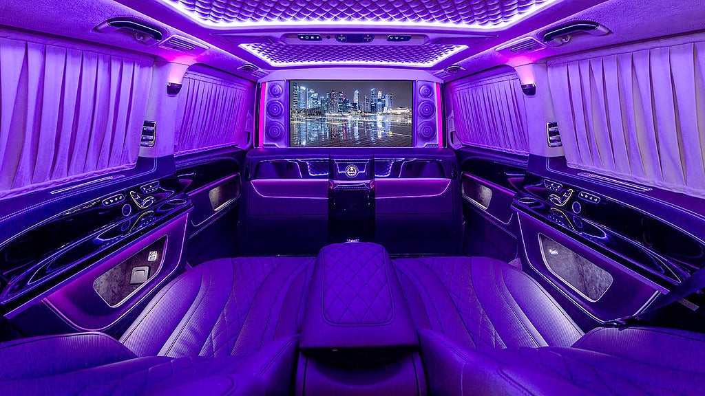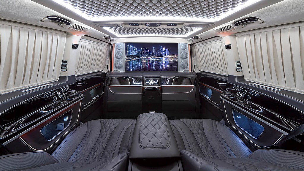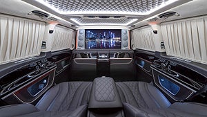 Med en Mercedes-Benz V-klass som bas möblerar TopCar om kabinen med tydlig inspiration av det värsta som Maybach har att erbjuda. Det går att välja ett fyrsitsigt passagerarutrymme, men du väljer så klart den tvåsitsiga varianten med fällbara vilstolar.