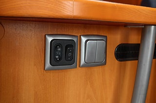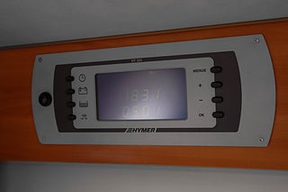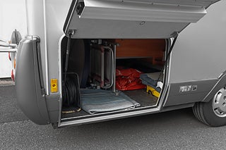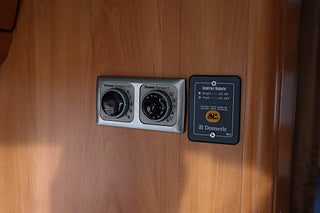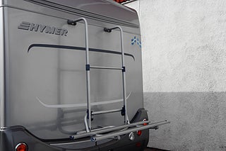 Utvändigt finns markis för sköna dagar samt cykelställ bak och elsteg för smidig insteg. HYMERs original kontrollpanel ger god översikt över bodelens funktioner och bilen har både 12V och 230V elsystem.