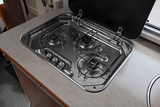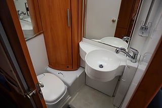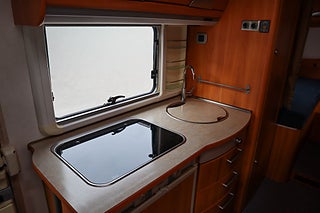 Köket är utrustat med gasolspis och diskho samt kylskåp, och badrummet erbjuder toalett och handfat i ett kompakt men funktionellt utförande. Husbilen är utrustad med Truma luftburen värme med varmvatten, vilket ger snabb och effektiv uppvärmning året runt.