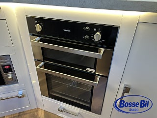 Välutrustat frontkök med gas och elhäll samt ugn och stor kyl med separat frys