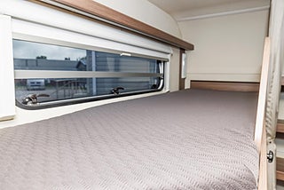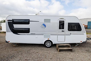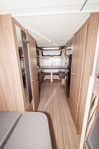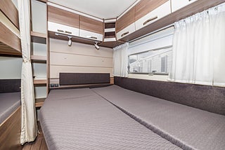 Husvagnen mäter 8 x 2,5 meter med en fin dubbelsäng, våningssäng till barnen, bra förvaring och fint ljusinsläpp.
