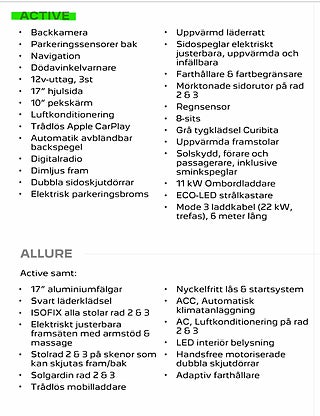 Utrustningsnivån på instegsmodellen active är riktigt bra utrustad med bla: Backkamera, Backsensorer, Navigation, Trådlös Apple Carplay, Dubbla sidodörrar, Uppvärmd Ratt, Regnsensor, LED strålkastare mörktonare rutor rad 2 & 3.