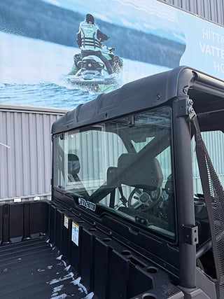 Utrustad med sporttak, framruta i glas och bakruta i glas.