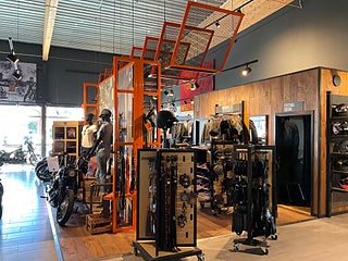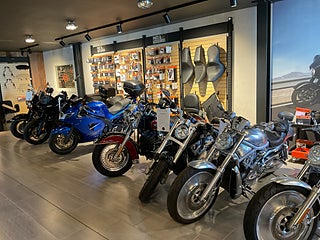 Vår butik är fylld med kläder, tillbehör och motorcyklar.