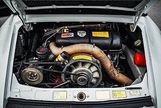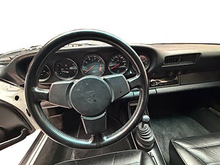 Den här exemplaren är elegant vit med svart läderinredning och svart cabriolet, en tidlös färgkombination som lyfter fram bilens linjer på bästa sätt. Under huven sitter den klassiska 3.0-liters boxersexan med runt 204 hk, kopplad till en 5-växlad manuell låda – precis som en 911 ska vara.