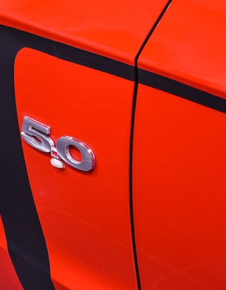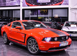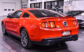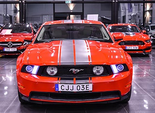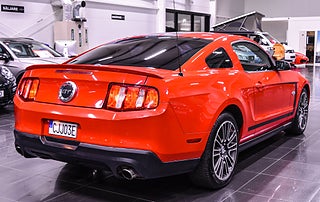 Här har du en riktig muskelbil som fångar blicken direkt – en Ford Mustang GT i klassiskt röd lack med svarta racingstripes. Den ikoniska designen tillsammans med den mullrande 5.0-liters V8:an på 418 hk gör den lika brutal på vägen som den är snygg att se på.