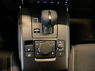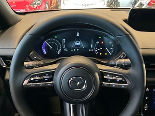LED-strålkastare med adaptiv nedbländning för helljuset, Nyckellöst låssystem med Smartkey, Automatiskt infällbara yttre backspeglar med automatisk avbländning på förarsidan, Mörktonade rutor bakom B-stolpen, Sidenmatt sektion med emblem "Mazda" på C-stolpe, Värmetrådar för vindrutetorkare (uppvärmda vändlägen), Minnesfunktion för head-up display och ytterbackspegel, Automatisk klimatanläggning, Appstyrning för laddning, Automatiskt avbländbar inre backspegel (ramlöst utförande), Head-up display med projicering på vindrutan, Head-up display med projicering på vindrutan, LED-interiörbelysning, Elektriska fönsterhissar fram, Korkinfattning på dörrhandtag, Läderklädd multifunktionsratt med rattvärme, 230V uttag (150 W) i kupéutrymmet, 230 V uttag (1500 W) i bagageutrymmet, Urkopplingsbar krockkudde på passagerarsidan, Autobroms med fotgängaridentifiering, Autobroms vid korsande trafik bakom bilen, e-Call automatisk nöduppringning, Parkeringssensorer fram och bak, 360 graders parkeringskamera, Döda vinkeln-övervakning med motstyrande effekt vid filbyte, Varning för korsande trafik framför bilen, Döda vinkeln-övervakning samt varning för korsande trafik vid backning, Elektronisk parkeringsbroms, Trafikskyltsavläsning, Filhållningsassistans, Trötthetsvarning med förarkamera, Bose ljudanläggning med FM/DAB-radio och 12 högtalare, Apple CarPlay och Android Auto, Integrerad navigation med Europakarta.