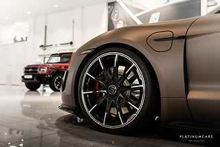 Nu i lager – en unik svensksåld Porsche Taycan 4S Brabus!? Folierad i exklusiv matt brun kulör (coffee beige är färgen undertill) med brun helläderinteriör – en oslagbar kombination som verkligen sticker ut. Detta är en av få Taycan Brabus i Sverige, vilket gör den till ett sällsynt tillfälle för den som söker något utöver det vanliga.